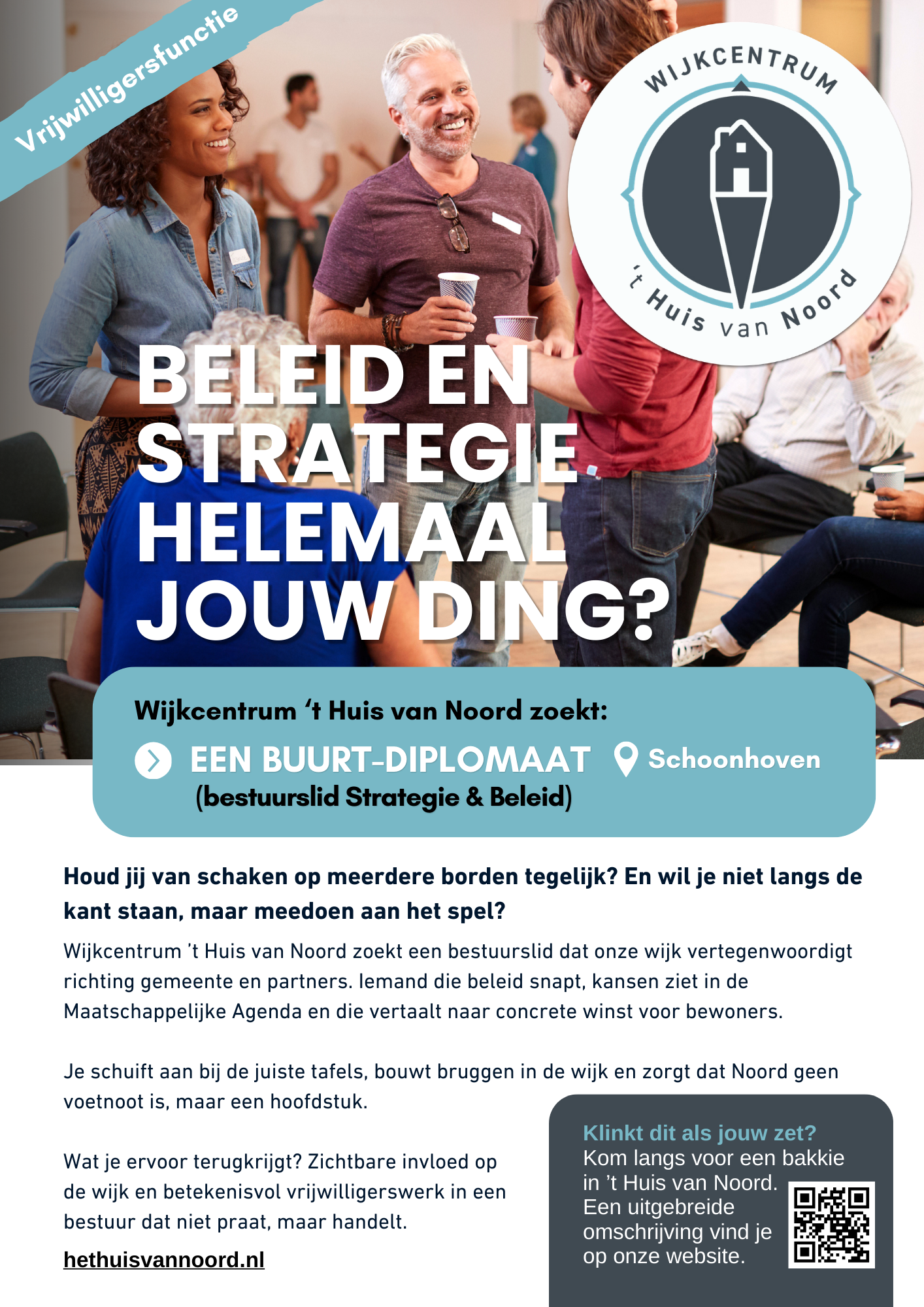 Is beleid en strategie jouw dagelijkse werk? En wil je die kennis inzetten voor iets wat dichterbij voelt dan dossiers en vergadertafels? Bij wijkcentrum ’t Huis van Noord zoeken we een Buurt-Diplomaat: iemand die met hoofd én hart meebouwt aan een sterke, sociale wijk in Schoonhoven Noord.