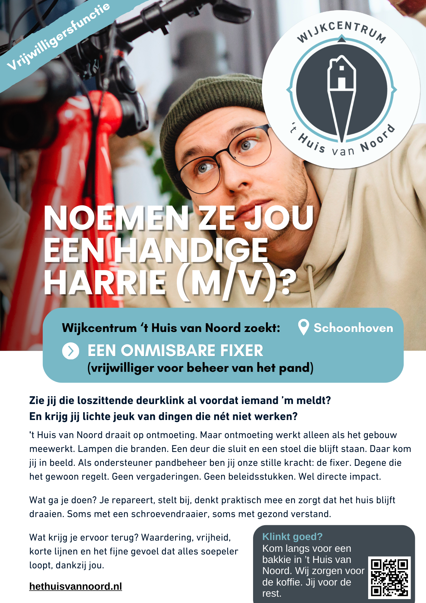 Wijkcentrum ’t Huis van Noord zoekt een onmisbare fixer: Vrijwilliger voor beheer van het pand Noemen mensen jou een handige Harrie (m/v)? Zie jij vanzelf wat er moet gebeuren en steek je graag de handen uit de mouwen? Dan zijn wij op zoek naar jou. ’t Huis van Noord is een bruisende plek met activiteiten, […]